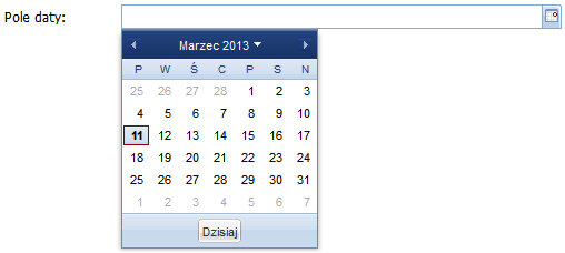 6) Pole daty - pole tego typu umożliwia korzystanie z podręcznego kalendarza, ułatwiającego wskazanie daty we właściwym dla danego formularza formacie (np. RRRR-MM-DD). Po kliknięciu w ikonkę kalendarza, znajdującej się na końcu pola pojawi się „karta” miesiąca kalendarzowego, na której należy wskazać właściwy dzień. W przypadku konieczności zmiany miesiąca i/lub roku, należy posłużyć się strzałkami znajdującymi się na górnej belce wyświetlonej „karty”;