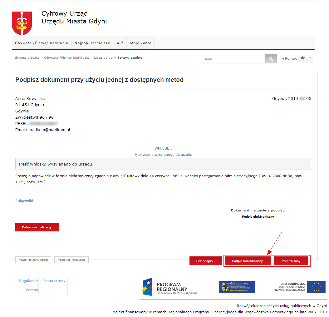Po wypełnieniu formularza elektronicznego kolejnym etapem będzie wybór metody podpisu dokumentu. Użytkownik, który chce skorzystać z usług oferowanych przez urząd, powinien posiadać: adres e-mail (elektroniczną skrzynkę pocztową), oraz certyfikat kwalifikowany (tzw. podpis elektroniczny) lub profil zaufany oferowany przez ePUAP.
