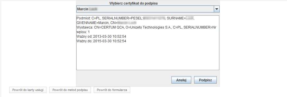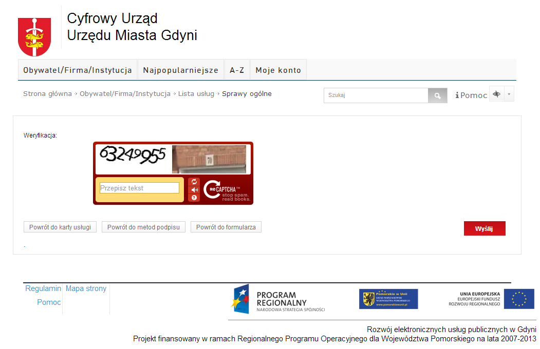 Uwaga: w przypadku, gdyby podpis dla danej usługi nie był wymagany, na omawianym etapie, użytkownik będzie miał do dyspozycji przycisk Bez podpisu, którego użycie spowoduje wyświetlenie zabezpieczenia reCAPTCHY.