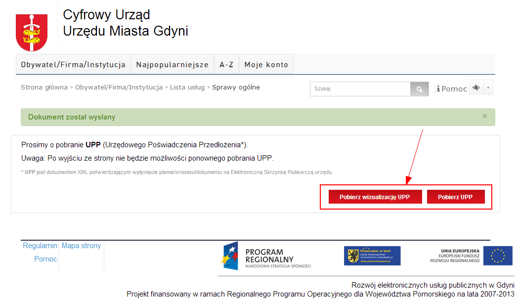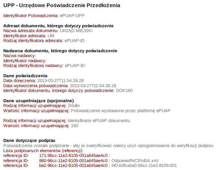 Po wypełnieniu formularza elektronicznego, podpisaniu i wysłaniu użytkownik otrzyma dokument elektroniczny potwierdzający doręczenie dokumentu do urzędu, czyli Urzędowe Poświadczenie Przedłożenia. UPP jest potwierdzeniem odbioru pisma przez urząd. Istnieje możliwość zapisania poświadczenia na dysku twardym komputera użytkownika.