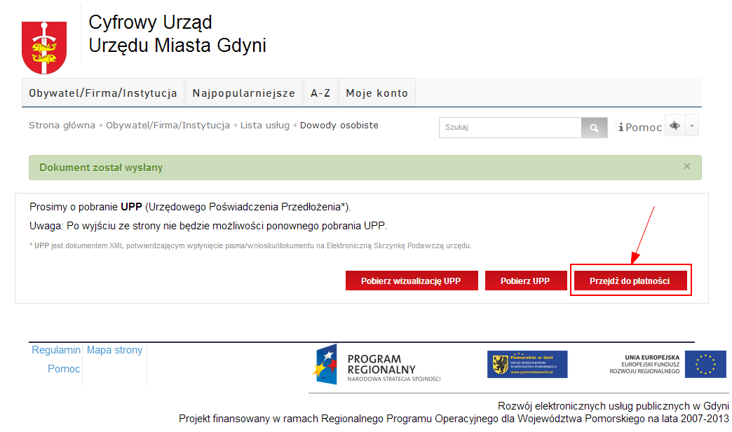 Najlepiej wnieść opłatę, po wypełnieniu, podpisaniu i wysłaniu dokumentu korzystając z przycisku Przejdź do płatności. Wniesienie opłaty po wysłaniu dokumentu, powoduje automatyczne powiązanie dokumentu z wniesioną opłatą, co ułatwi procedowanie sprawy w urzędzie.