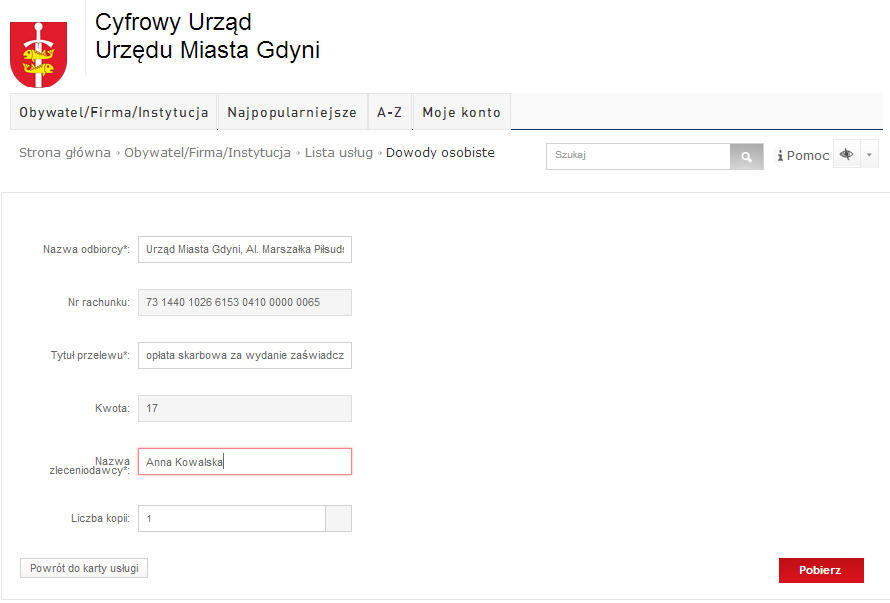 Uwaga: w zależności od konfiguracji karty usługi przez urząd, w polu Kwota, może być podana stała wartość lub edytowalna, której wysokość użytkownik będzie mógł modyfikować.