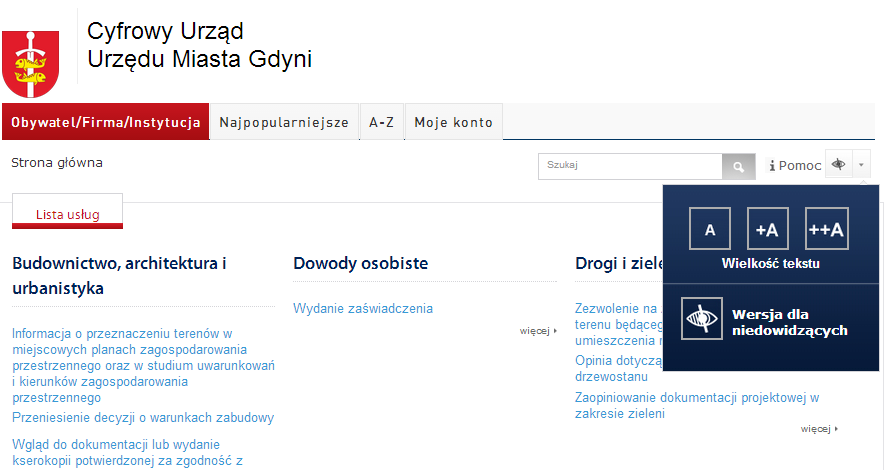 Narzędzia znajdujące sie w górnym, prawym rogu witryny umożliwią zmianę wielkości czcionki, oraz zmianę kolorystyki wyświetlanego tekstu. Rozwiązanie jest użyteczne nie tylko dla osób niedowidzących, ale także dla większości internautów.