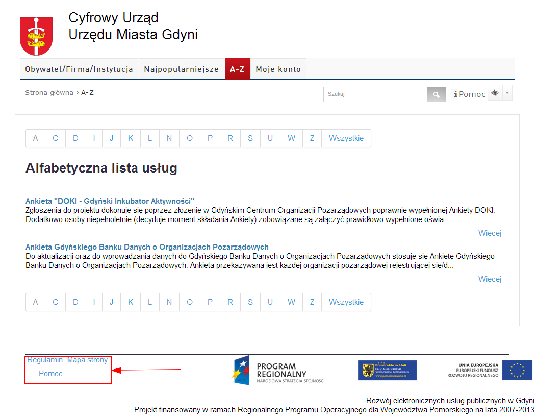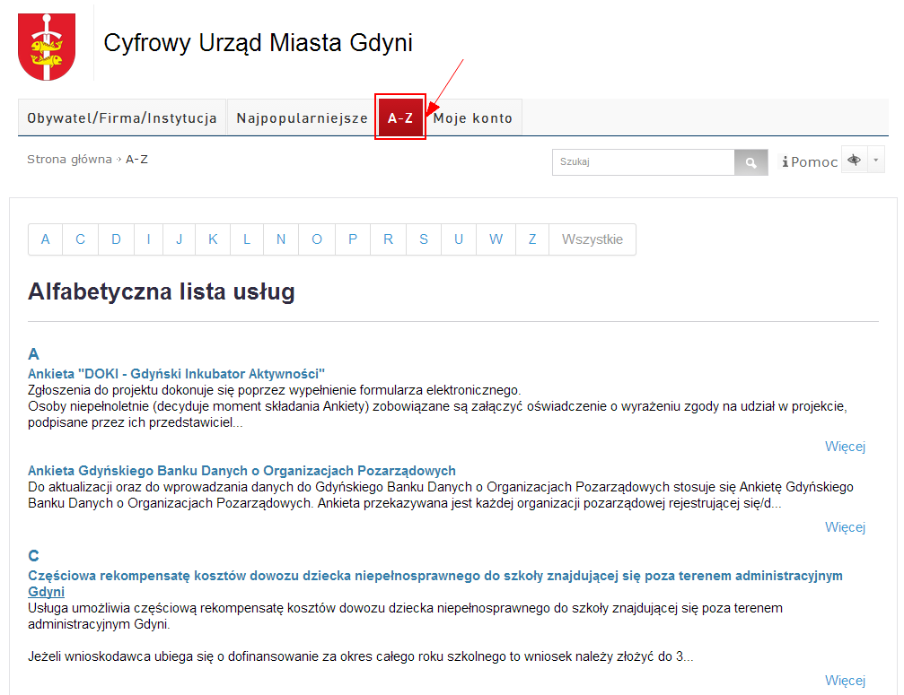 • poprzez skorzystanie z alfabetycznego spisu usług: zakładka A-Z (lista prezentuje te zaczynające się na wybraną literę alfabetu. Litery, pod którymi nie kryją się żadne usługi są niewidoczne);