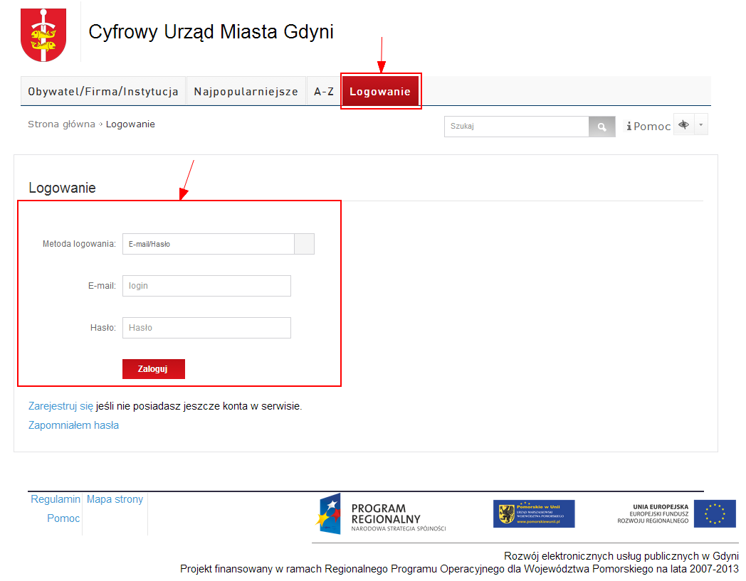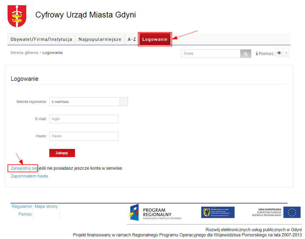 W celu zalogowania się do systemu, należy przejść do zakładki Logowanie, znajdującej się w menu górnym.