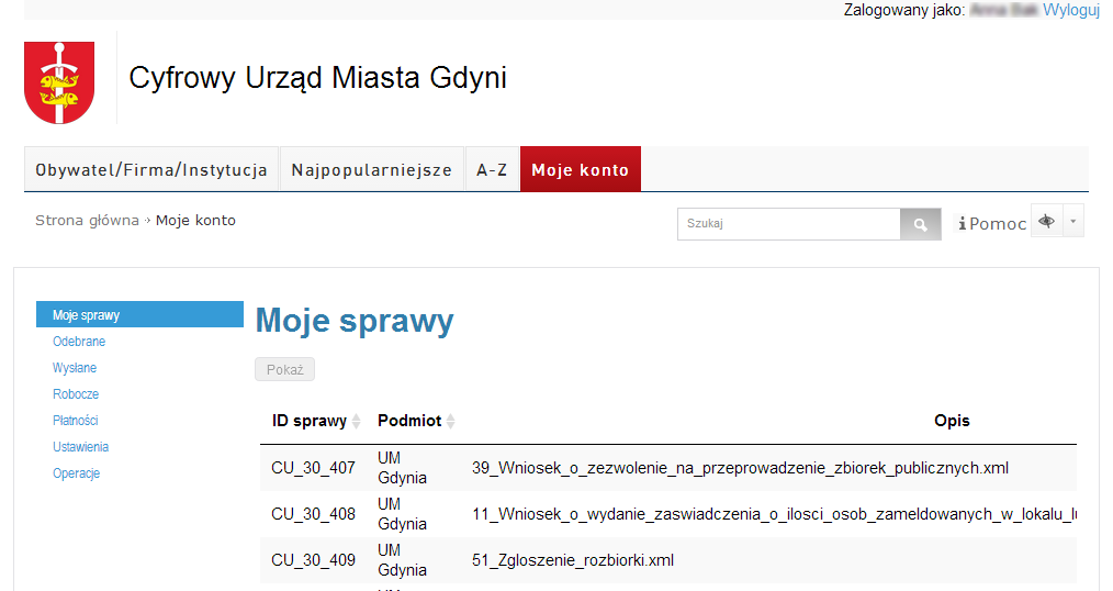 Moje sprawy – na ekranie roboczym zostanie wyświetlona lista spraw przez nas zainicjowanych;