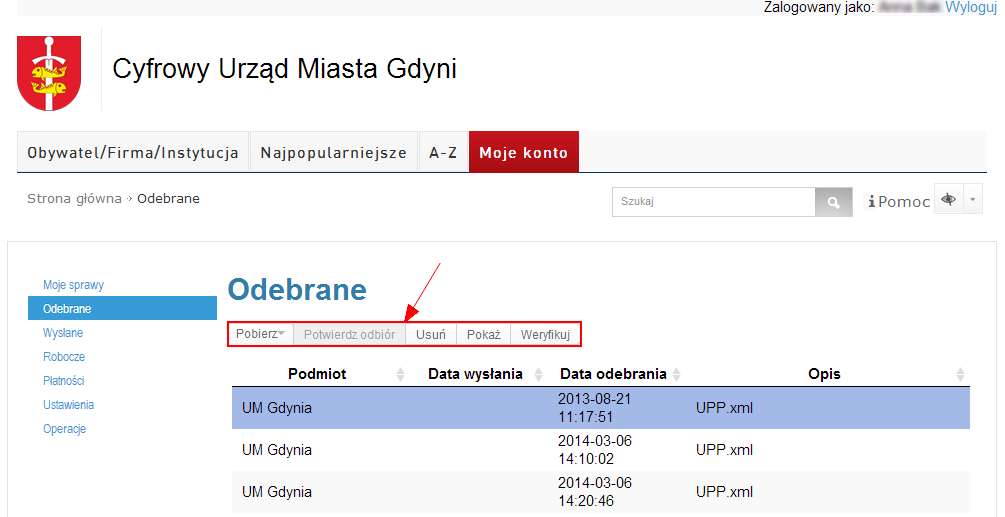 Potwierdź odbiór – użycie przycisku umożliwia potwierdzenie odbioru dokumentu. Narzędzie dostępne jest dla pozycji Urzędowe Poświadczenie Doręczenia (UPP). Po podpisaniu UPP otrzymamy dostęp do treści dokumentu;