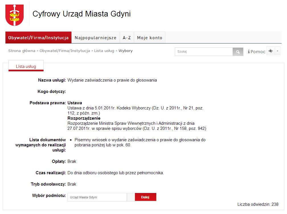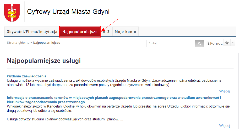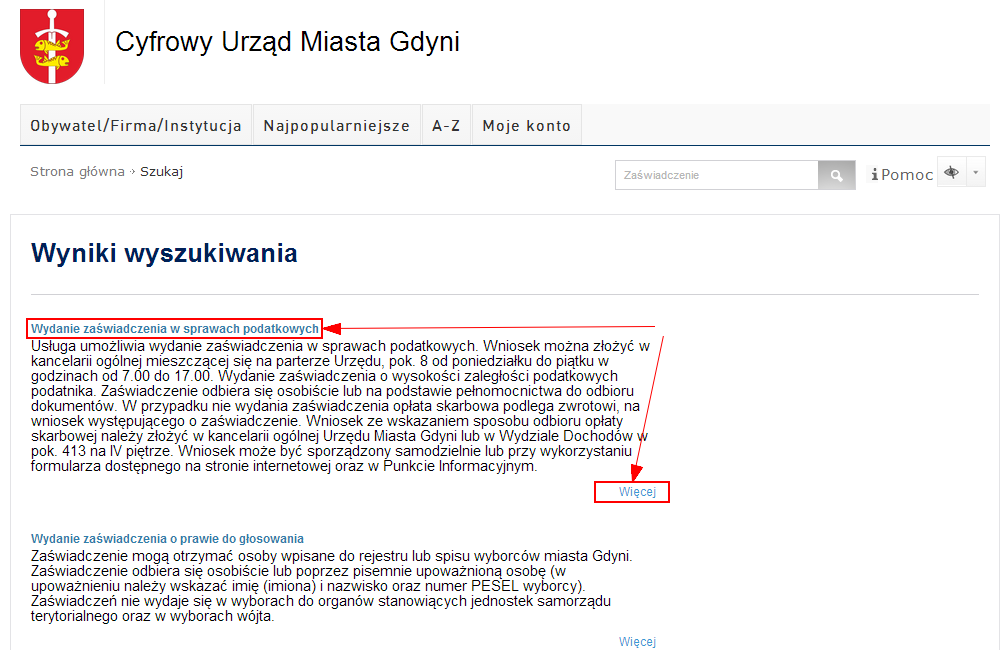Internauta po odnalezieniu sprawy, którą chciałby załatwić, powinien kliknąć na nazwę usługi lub skorzystać z odnośnika Więcej, co spowoduje wyświetlenie Opisu usługi.