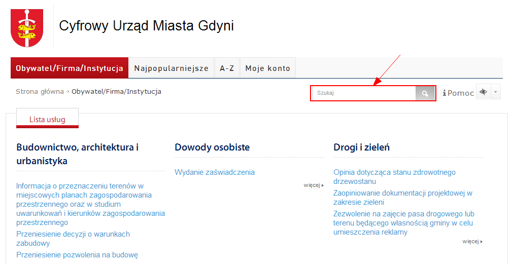 • do usługi można również dotrzeć korzystając z Wyszukiwarki dostępnej w górnym rogu strony portalu. Działanie wyszukiwarki jest standardowe. Należy wpisać słowo bądź frazę, które najlepiej opisuje poszukiwaną usługę, a następnie użyć symbolu lupy bądź klawisza Enter.